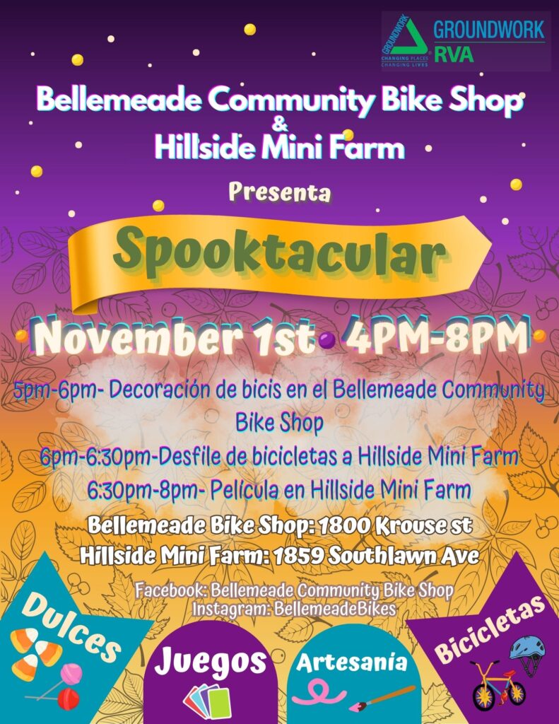 Únete a la Bellemeade Community Bike Shop y a Hillside Mini Farm para una tarde otoñal de bicicletas, dulces y una película bajo las estrellas. Trae a tus amistades, decora tus ruedas y rueda con nosotros hasta la granja para ver una película apta para toda la familia.